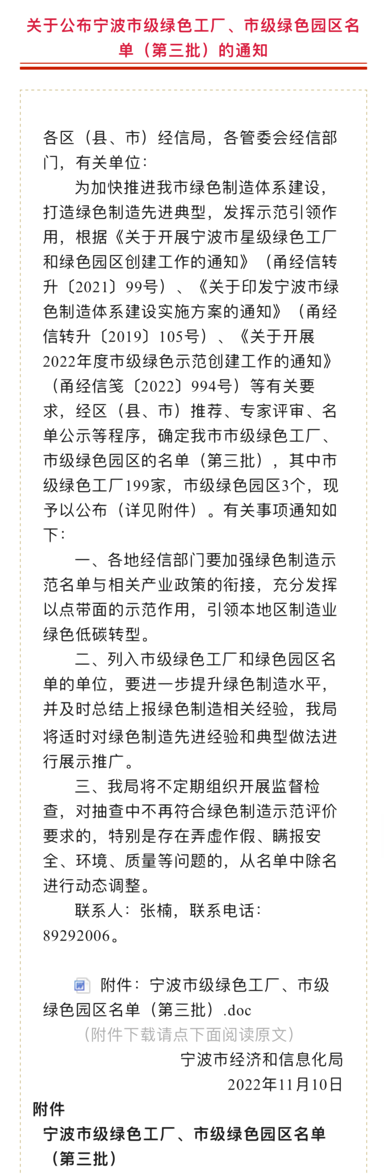 2022年11月18日,寧波市發(fā)布了2022年度寧波市級綠色工廠、市級綠色園區(qū)名單,對符合“綠色發(fā)展”倡導的企業(yè)予以認定,青湖成功入選“綠色工廠”,標志著公司構(gòu)建低耗高效、持續(xù)環(huán)保的綠色制造體系邁上新臺階。